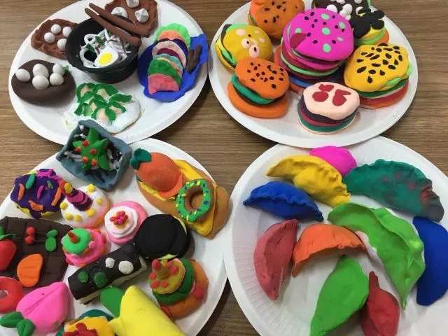 在老师的指导下,孩子们用五彩的橡皮泥,通过自己的想象和灵巧的双手认真的捏造着。一个个栩栩如生的作品呈现在大家面前,孩子们争先恐后的向老师展示自己的作品:汉堡、番茄、茄子……脸上都洋溢着兴奋和自豪。