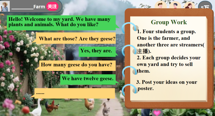 颜辛璎老师在教育一线深耕多年,积累了丰富的教学经验,形成了自己独特的教学风格。此次亮相课,她巧妙地以“Fun Farm”为课堂主题,打造了一堂妙趣横生的听说课。课堂在李子柒的精美视频中拉开帷幕,瞬间点燃了学生们的学习热情。小组合作环节中,学生们齐心协力攻克句型难关,彼此的思维碰撞出智慧的火花;精准的听力训练,则像是一把精准的钥匙,为学生打开理解之门。 而最令人眼前一亮的是颜老师将直播这一新颖形式巧妙融入课堂。学生们化身“小主播”,在真实而生动的语境中,自信满满地输出当堂所学知识。这一创新之举,正是“让每个孩子站在舞台中央”的鲜活体现。每个学生都有机会展示自己的学习成果,在众人面前锻炼口语表达能力,课堂成为了他们绽放光芒的舞台。在这一过程中,学生们不仅提升了语言能力,更收获了自信与勇气,如春苗般在舞台上茁壮成长。