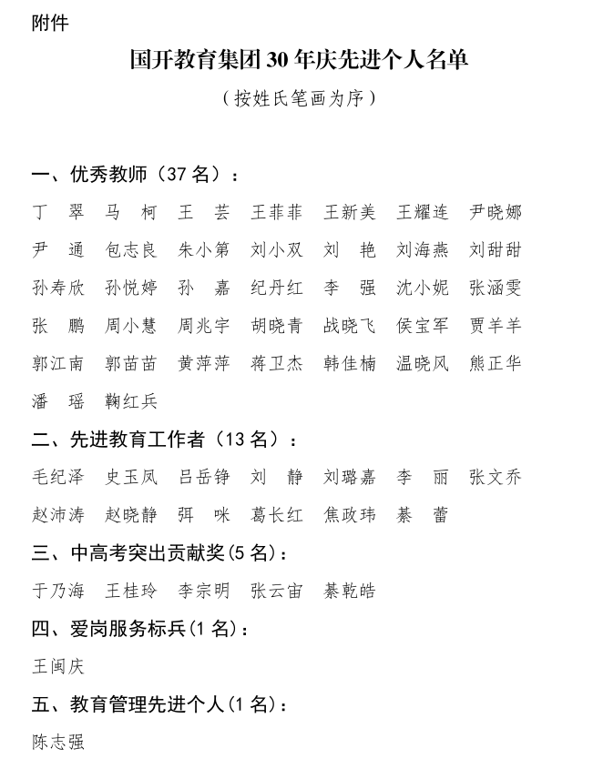 为表彰先进、树立标杆,进一步激发全体教职工的育人热情与奋进动力,值此集团 30 年庆之际,根据国开教育通字[2025]13号《国开教育集团关于开展 30 周年庆先进评选表彰工作的通知》文件规定,遵循公平、公正、公开的原则,经各单位民主推荐,集团办公室人事处、集团监察委员会、集团财务审计部审查,集团管委会、集团董事会研究,决定授予丁翠等 37 名同志“优秀教师”、毛纪泽等 13 名同志“先进教育工作者”、于乃海等 5名同志“中高考突出贡献奖”、王闽庆同志“爱岗服务标兵”、陈志强同志“教育管理先进个人”、柳鹏程同志“先进工作者”、张丽梅同志“优秀校长”、王晓娜同志“特殊贡献奖”、曹雪丽同志“国开功勋”荣誉称号。
