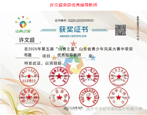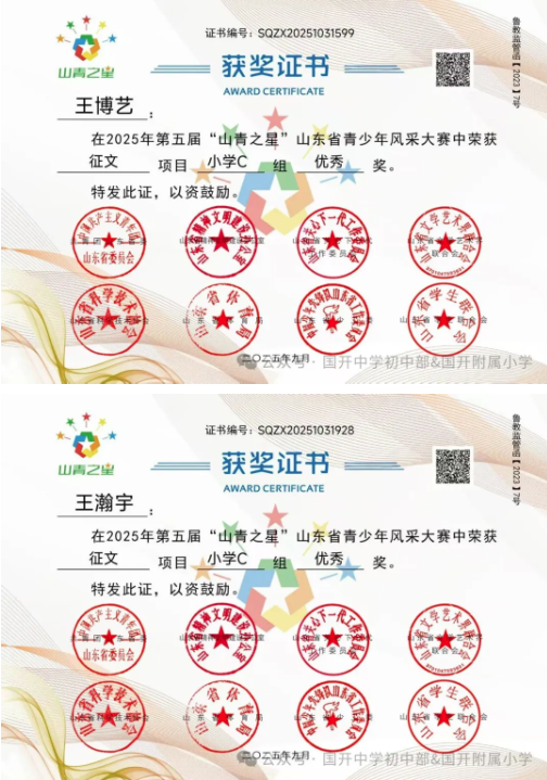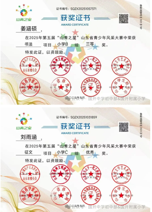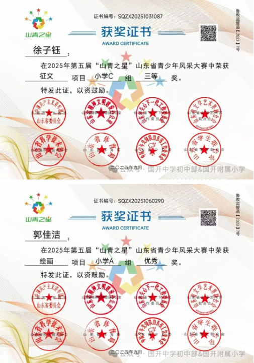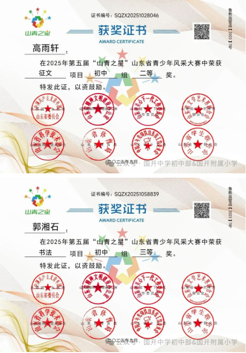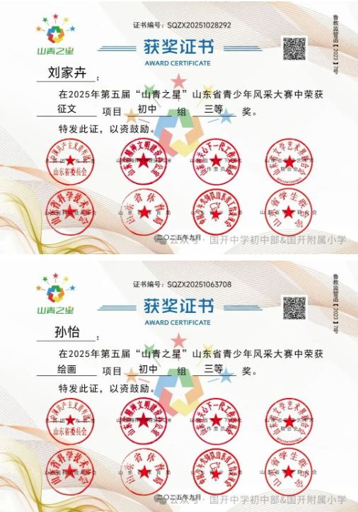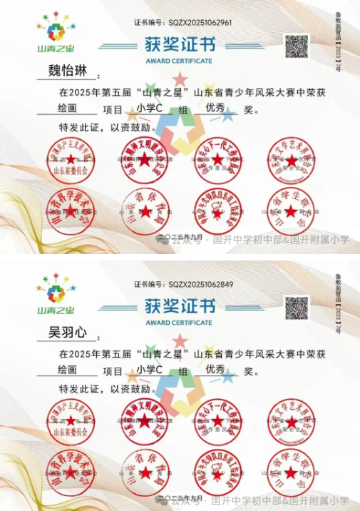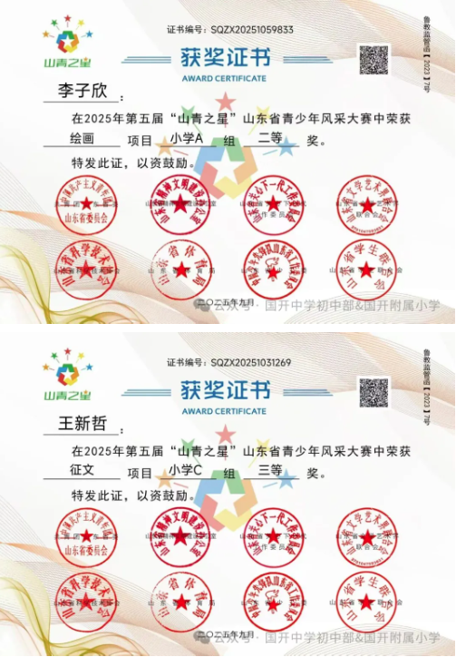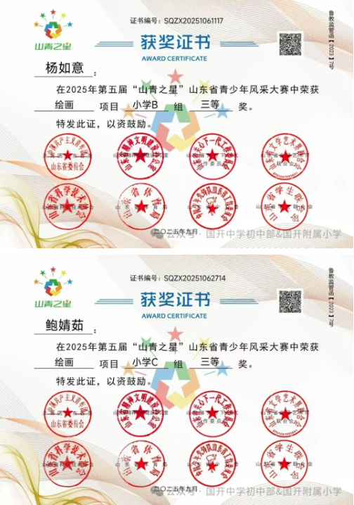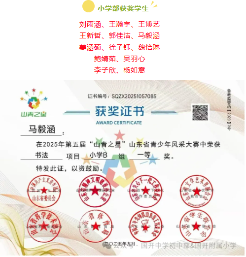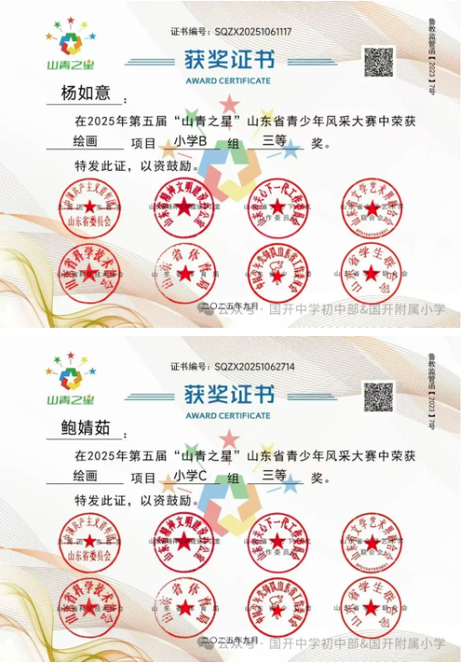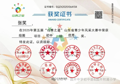 捷报频传奏凯歌,硕果飘香誉满园。 近日,由共青团山东省委主办,多家省级单位支持的2025年第五届“山青之星”山东省青少年风采大赛评选结果揭晓。国开中学初中部、国开附属小学的学生在 “逐梦科技星河 点亮青春之光” 美育比赛单元中表现卓越,成绩斐然,共斩获22项大奖,充分彰显了国开学子出色的艺术才华和全面的综合素养。