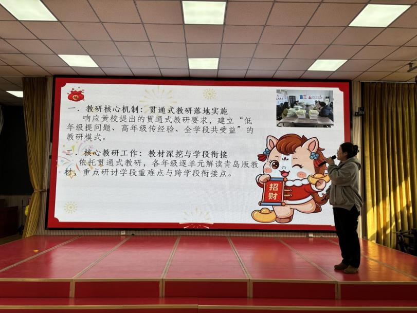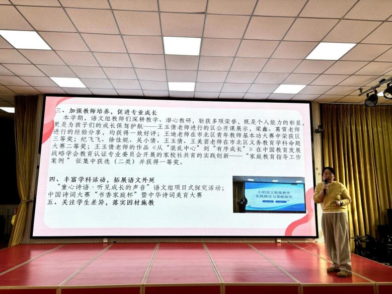教学深耕,各展风采。语文组、英语组、数学组教研组长依次带来亮点工作汇报。语文组凝心聚力抓教研、精耕细作提质量,落实课标要求,丰富教学活动,实现教学与教研双向赋能、师生共成长。数学组聚焦各学段数学核心素养培育,以课堂实践为根基、以问题研讨为导向、以经验共研为纽带,稳步推进数学教学提质增效与教师专业成长。英语教研组创新英语实践活动形式,切实提升教学质量与学生综合运用能力,落地高效课堂,助力学生英语核心素养稳步提升。