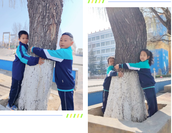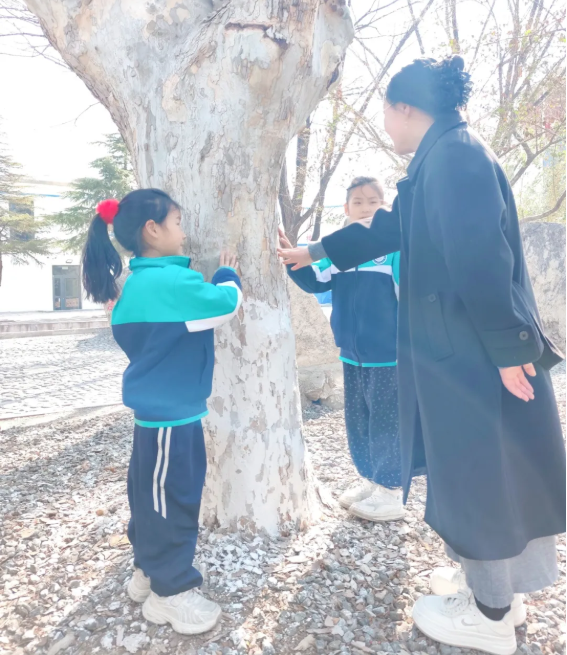 为了让孩子们更真切地感受树木的生命力,老师带领大家开启了一场“树木探秘”之旅。孩子们伸出小手,轻轻拥抱小树,感受生命的温度;指尖轻抚粗糙的树皮,感受大自然赋予树木的独特纹理。老师结合实物,耐心细致地讲解树木的生长知识、作用以及保护树木的重要性,孩子们听得津津有味,眼中满是对自然的好奇。