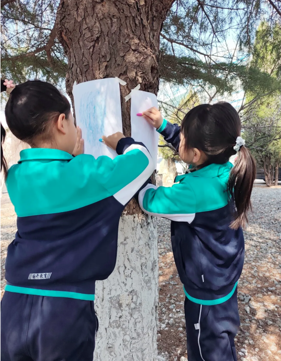 最有趣的环节当属树皮拓印!孩子们拿起蜡笔,在白纸上轻轻涂抹,不同树木的纹理渐渐浮现,有的粗糙、有的细腻、有的纹路笔直、有的蜿蜒交错。大家惊喜地发现,原来每一棵树都有独一无二的“皮肤”,在动手操作中直观认识了不同树木的特征,收获了满满的知识与快乐。