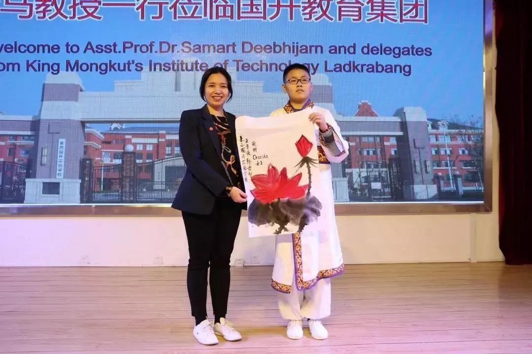 学校七年级三班的学生们为泰国先皇技术学院Samart教授一行表演了经典文化节目《满江红》,七年级二班孙睿同学和七年级三班李佩璇同学现场演示中国书法,并向沙马教授赠送了现场书写的书法作品。考察团一行对同学们气势非凡的表演频频称赞,泰国先皇技术学院Samart教授更是竖起了大拇指。