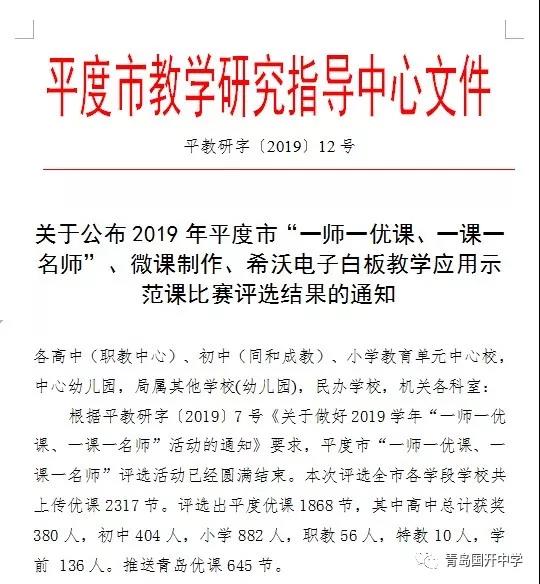 【喜报】青岛国开中学在2019年平度市“一师一优课、一课一名师”活动中喜获佳绩
